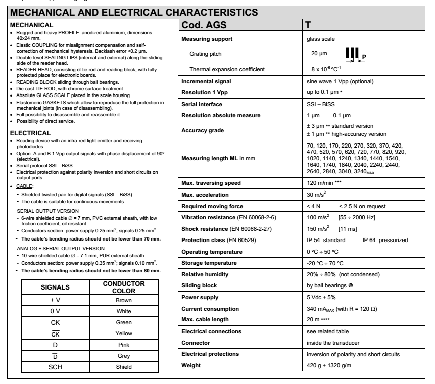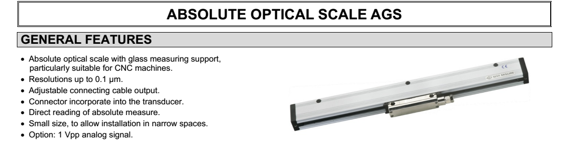 產(chǎn)品介紹絕對式光柵尺AGS、 ?運用光學玻璃測量技術(shù)支持的絕對光柵尺,特別適合于數(shù)控機床。 ?串行接口SSI,BISS,有或沒有1 VPP模擬信號。 ?分辨率高達0.1微米. ?精度等級±3微米在標準版和±1μM在高精度版本。 ?SSI協(xié)議和可編程分辨率。 ?Profibus-DP現(xiàn)場總線,CANopen,DeviceNet,PROFINET,Modbus協(xié)議轉(zhuǎn)換網(wǎng)關通過DRIVE-CLiQ。 提供每一尺計量證書。 ?線性熱膨脹系數(shù)的λ= 8×10-6°C-1。即使在高速情況下 ?精度高、穩(wěn)定性強、振動加速度信號。 ?可調(diào)連接電纜輸出。 ?連接器內(nèi)的傳感器。 ?防止電源極性和短路輸出端口反演。 ?體積小,允許在狹小的空間安裝