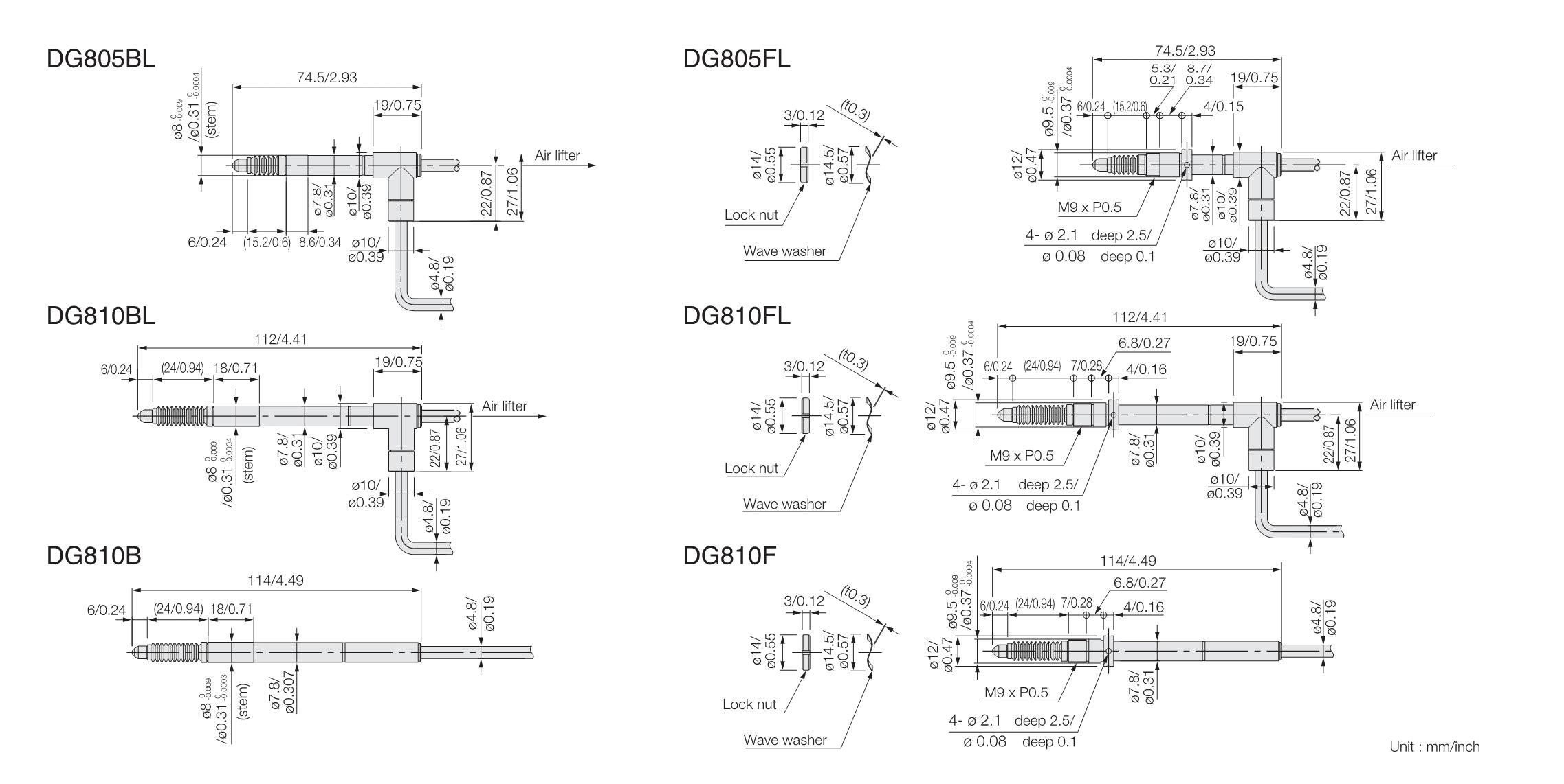 產品特性: 日本索尼Magnescale高精度探規DG810/805系列 產品特點: 1.磁力式; 2.適用于各種工廠作業環境,耐油、水、灰塵、震動、沖擊能力強; 3.解析度:0.5μm; 4.精度:2μm; 5.量測范圍:5.2mm,10mm; 6.小型細箱條狀:Φ8mm(外直徑),74.5mm(DG805); 7.低量測力; 8.使用氣壓元件可垂直移動轉軸(DG805BL/FL,DG810BL/FL); 9.防塵保護套(標準件); 10.安裝容易,亦可選購法蘭型探規。