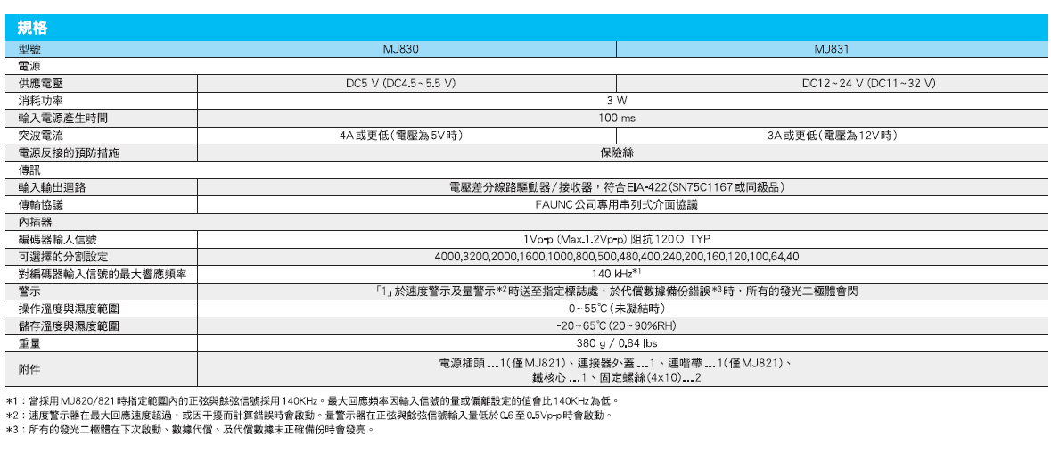 產品介紹簡單介紹: 用于三菱MR-J2超級系列放大器的內插器MJ830/MJ831 信號轉換器放大器MJ830/MJ831; 允許直流補償、增益補償、相位差補償, 配用產品:PL101,SH12及通用類似輸出編碼器。 適用于三菱公司專用串列式介面協議。特性: 產品特性: 用于三菱MR-J2超級系列放大器的內插器MJ830/MJ831 輸入阻抗 Input impedance:120 Ω 差動輸入電壓 voltage differential input:1 Vp-p 最高響應頻率Max. response frequency:140 kHz for any number of divisions selected 電源 Power supply:MJ830 DC 5V(4.5-5.5V);MJ831 DC 12V-24V(11V-32V)